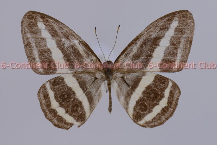 翅表の地色は灰褐色~黒褐色。前後翅にかけて白色の斜帯が4本配置する。中央の白帯は太く明瞭であるが、基部側の2本は不明瞭である。亜外縁の白帯は前翅翅頂部では不明瞭で、下方程明瞭になり後翅では明瞭に現われる。加えて、前後翅共に外縁に不明瞭な白帯が配置する。また、中央白帯と亜外縁白帯の間に、翅裏の眼状紋が透けて見えるように現れる。