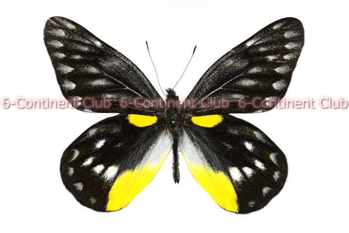 翅表の地色は黒色で、前後翅共に外縁と中央に不鮮明な白斑が縦に配列する。後翅中央の白斑は鮮明に現われる。後翅表面基部に楕円形の黄斑が鮮やかに現われ、後翅肛角に黄斑が広く現われる。