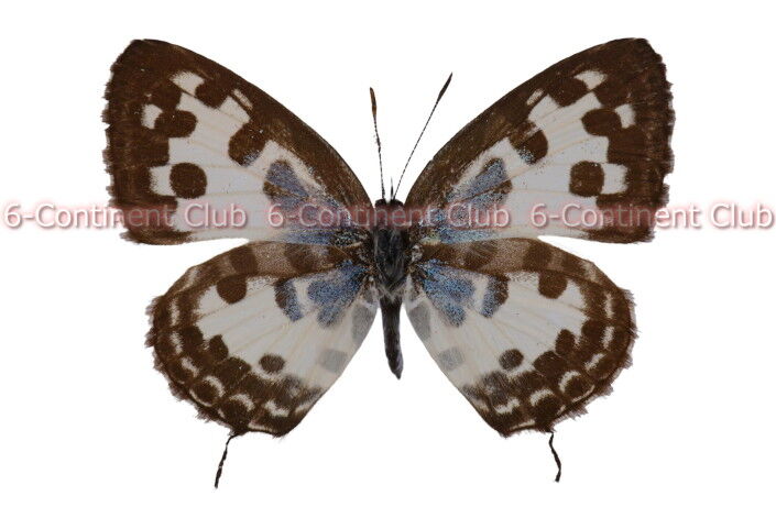 翅表の地色は白色で、前後翅共に前縁から外縁に太い黒帯がある。また、亜基部から基部には淡青色の鱗粉が散布する。前翅表面の外中央には大きな黒斑が3個並び、前縁の黒帯に接して黒斑が2個配置する。後翅表面外縁の黒帯内各室に波状白線が現れ、この黒帯内側に接して黒斑が並ぶ。さらに前縁から基部に黒斑が散在する。