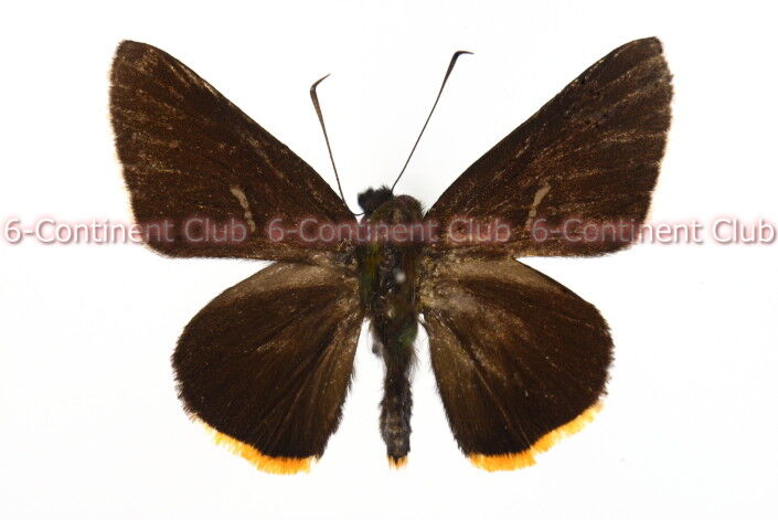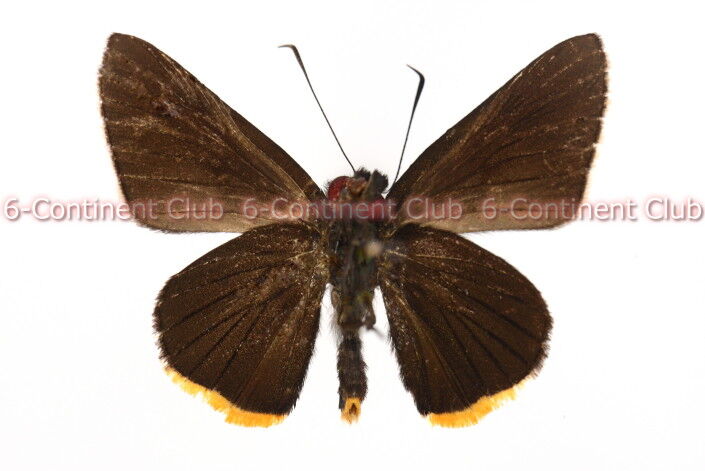 ♂翅表の地⾊は黒褐⾊。前翅は無紋であるが、中央部に細い灰⽩⾊線条の性標を縦に現わし、外縁の細い縁⽑は⻩⾊になる。後翅表⾯も無紋であるが、内縁側には黒褐⾊の⻑⽑がある。後翅外縁下部から肛⾓にかけて⻑い⻩⾊の縁⽑があり、地⾊との対⽐で⽬⽴つ。