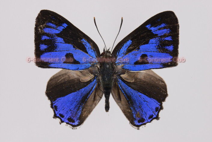♂の翅表は、黒色の地色に鮮やかな青色の紋が配列する。前翅の青色斑紋は変異が大きいが、後翅ではほぼ中央から下部を横切る青条以外は黒色になる。