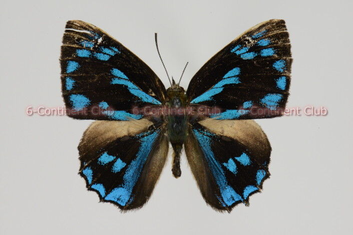 ♂の翅表は、黒色の地色に鮮やかな青色の斑紋が散在する。