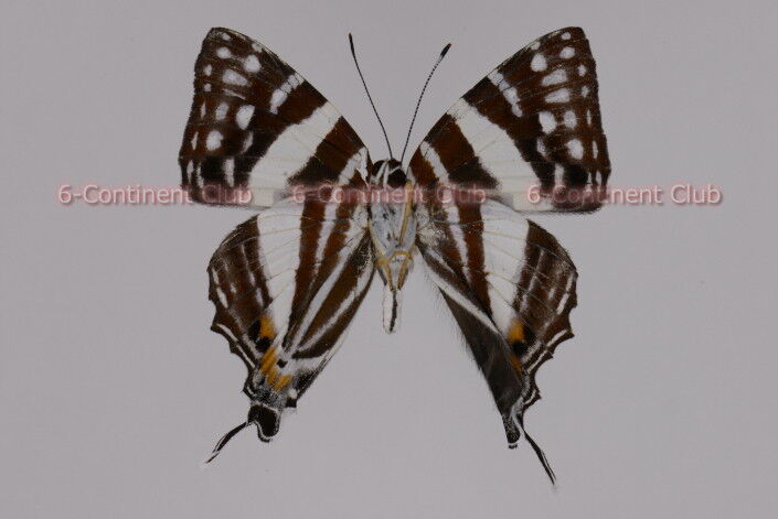 翅表の地色は黒色で、前翅中央に白帯が斜めに配置し、後翅中央に白帯が縦に配置する。前翅には白帯の上方に白斑が3個並び、翅頂に白点が複数配置する。後翅肛角には橙斑があり、その下に細い尾状突起がある。翅裏の地色は表面よりやや明るい黒褐色で、斑紋は表面と同様に白帯が前後翅に配置すると共に、前翅基部に白条が1本現われ、後翅には3本現われる。また、前翅裏面の外縁には小白点が、亜外縁には白斑が配列する。後翅裏面の外縁には細い白線条が複数配置する。